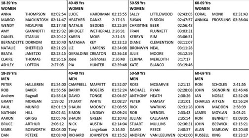 ![]() ![]() ![]() The Record Times F28 Sarah Klein 2:00:10 (2024) M28 James Laven 1:42:31 (2022) F28 Boardies Lauren Das 2:54:06 (2024) M28 Boardies Trent Harlow 1:50:44 (2013) F56 Lucy Bartholomew 4:33:58 (2018) M56 Ash Watson 4:00:37 (2019) F56 Boardies Natasha Fraser 5:02:24 (2015) M56 Boardies John Csongei 4:25:44 (2024) Age Category & Teams Records are here. 21st Annual but Fifteenth Official Two Bays Trail Run Jan 12th 2025 https://tomatotiming.racetecresults.com/results.aspx?CId=16&RId=29748
